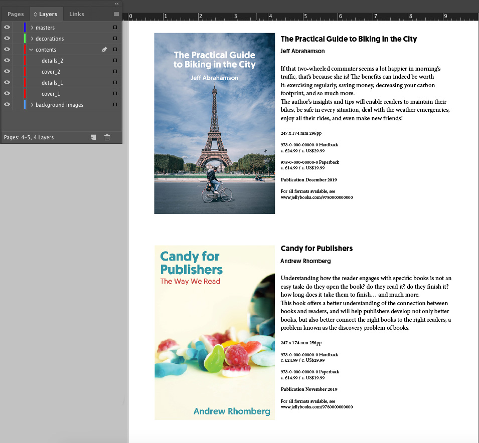 In other words, the logical order is reversed in the “Layers” panel. If we add another book, then its object and text frames should come on top of the existing layers: