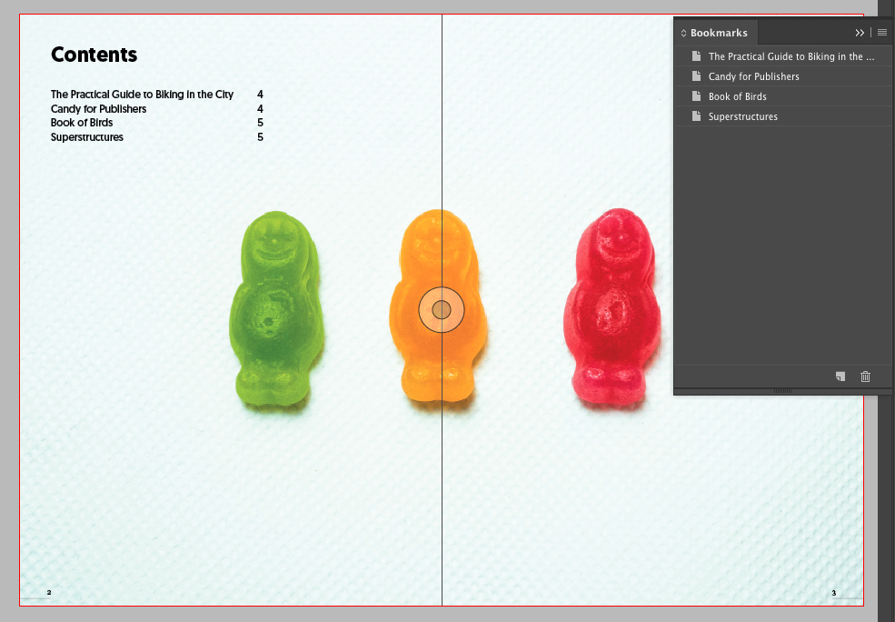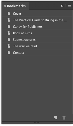 To add a bookmark, select a page, right-click and select “Interactive > New Bookmark”.