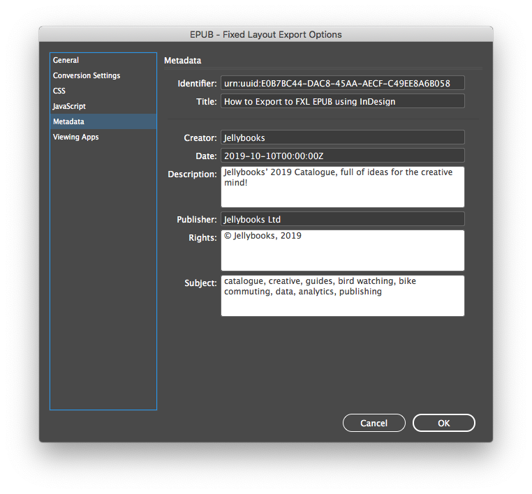 Please ensure you include the title of the Catalogue because it will be displayed in the Jellybooks Cloud Reader user interface – otherwise, InDesign will default to using the filename of your document as its title. Do not hesitate to fill in other fields too.