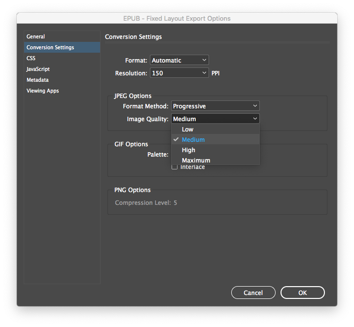 We recommend trying “Medium” for JPEG Image Quality and checking whether it’s a good compromise in an EPUB app such as Adobe Digital Editions 4.5 or Apple Books. Sometimes this option can help you cut the EPUB file size by half.