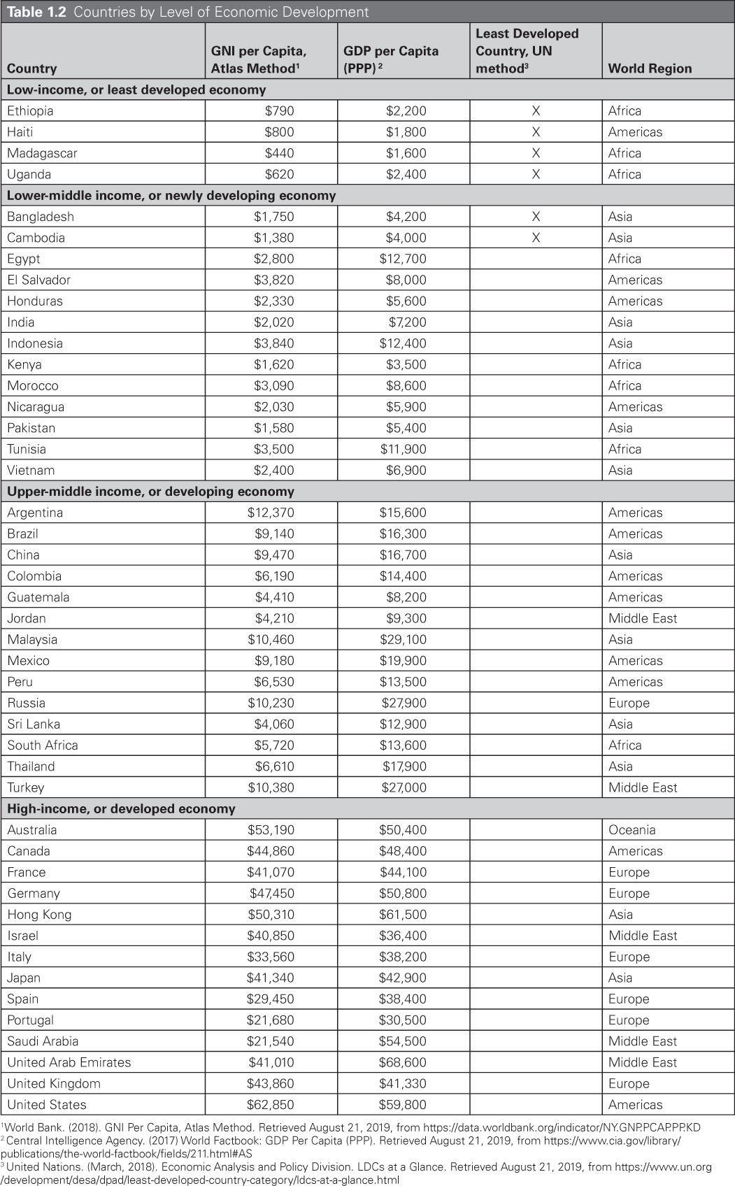 A slightly different classification of countries based on their level of development is used by United Nations (UN). In 2018, UN included 47 nations in the group of least developed countries (LDCs) with the purpose to coordinate international support measures for these economies. LDCs are “low-income countries confronting severe structural impediments to sustainable development” (United Nations, n.d., para 1). Refer to Table 1.2 where these countries are marked with an “X” (Column 3). All countries classified by World Bank into the low-income group are also included in the LDC category. In addition, several countries in the lower-middle income group, such as Bangladesh and Cambodia, are also considered as LDCs by the UN.