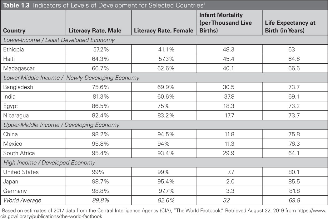 • Using two different approaches presented in the chapter (GDP per capita and GNI per capita), determine the level of economic development for each of the five countries (newly developing, developing, or developed). Justify your classification.