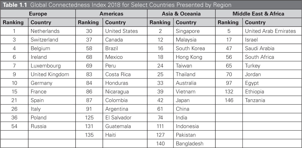 You can see from Table 1.1 that Europe was the most connected region, where eight of the top ten most globalized countries are located. With the exception of Russia (54), the countries’ rankings are less than 40. Overall, Europe had the highest scores for the trade and people interconnectedness. Netherlands was the most connected economy in the world. In contrast, North America emerged as the leader in the capital and information flows. The region was ranked second among the world regions in terms of globalization. The most globalized countries in the Americas were the United States (30) and Canada (37). The rest of the countries’ connectedness index ranges from 58 (Brazil) to 135 (Haiti).