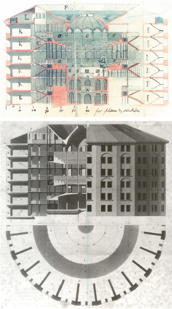 Over the decades, historians have debated the role of technology in factory work organization. The architecture of the new factories had much in common with prisons. Jeremy Bentham coined the term ‘panopticon’ in 1816 to describe a circular building that could provide ‘hierarchical observation’ and ‘normalizing judgement’ (Figure 2.1). Observing Victorian architecture and Bentham’s idea of a panopticon, the twentieth-century philosopher Michel Foucault asked, ‘Is it surprising that prison resembles factories, schools, barracks, hospitals, which all resemble prisons?’ (Foucault, 1977: 30). The suggestion is that the factory provided capitalists with a formal role as managers.