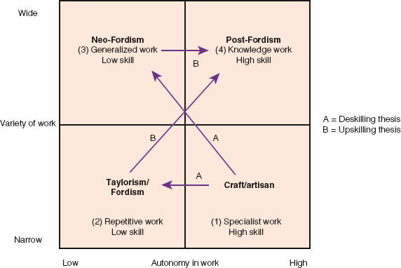 In addition to the four broad classifications of work organization, the model shows two trends proposed by the proponents of the ‘deskilling’ and ‘upskilling’ theses. The deskilling thesis maintains that, in Western capitalist economies, there is a general trend in paid work towards a narrow variety of tasks and low autonomy; the arrows marked ‘A’ in Figure 2.2 represent this trend in the diagram. The upskilling thesis suggests an opposite trend towards a wide variety of tasks and high autonomy in work; the arrows marked ‘B’ represent this trend. It is important to understand that different regimes of work organization affect the nature of the employment relationship, whether or not this is explicitly acknowledged in the writings of organizational theorists. For example, if work is reorganized to deskill or upskill employees, this will change the degree of interdependence, and typically the power dynamics, between the employer and employee. Chapter 12 explores the deskilling/upskilling debate in detail.
