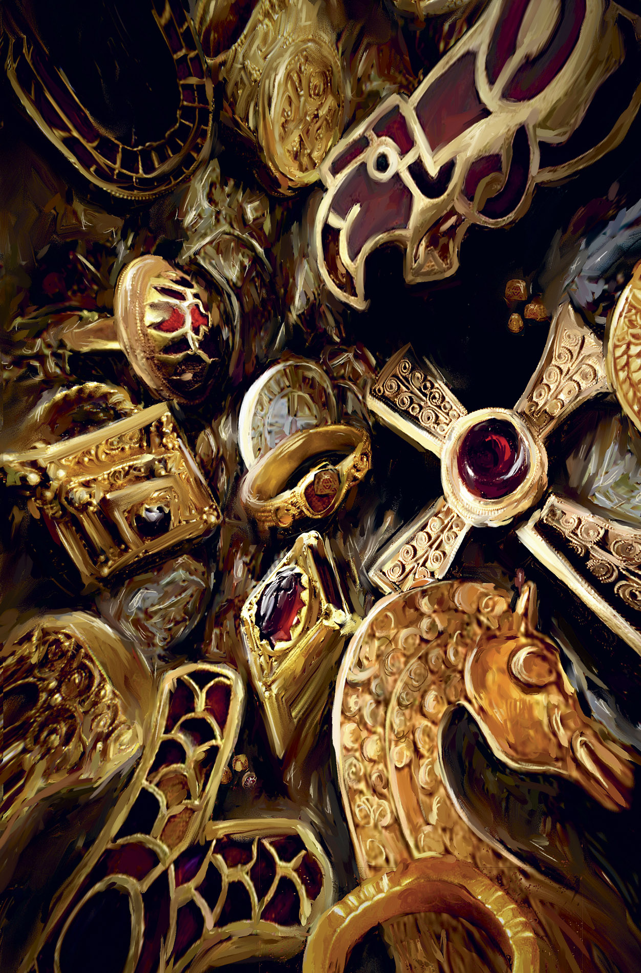 A certain magic surrounds gold. As with other seemingly supernatural acts of the smith (the Germanic pagans worshipped Weyland the Smith as a god), the process of working gold was seen as almost alchemical – turning solid to liquid and back again. When Beowulf finally wins the treasure hoard from the dragon, he finds it carries a spell which means no man can possess it and it has to be left to the earth, ‘useless to men’.