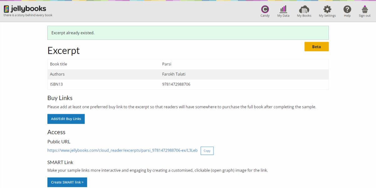 Bookshop wishing to create a SMART link need to visit the Jellybooks Bookshop portal, search and select the book of interest, and then use the CREATE SMART link button.